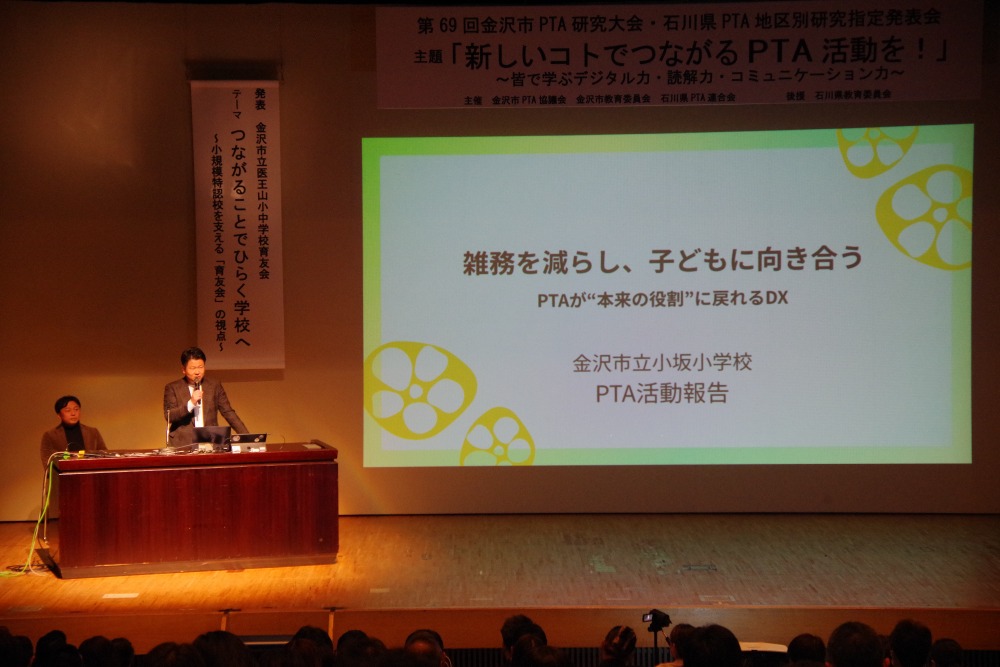 金沢市PTA連合会 鶴山雄一会長、石川県PTA連合会 泉 博之 会長からの挨拶、研究指定発表PTAである金沢市立小坂小学校PTAから、「雑務を減らし、子どもに向き合う PTAが”本来の役割”に戻れるDX」と題して発表をしていただきました。県PTA子ども教育環境委員会ネットモラルキャラバン隊による「ネットやスマホとの上手な付き合い方についてもお話をさせていただきました。