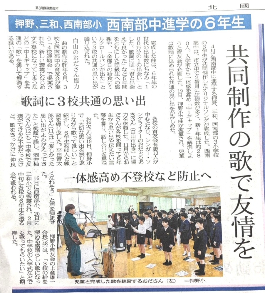 今年度、西南部小学校、押野小学校、三和小学校の育友会の3校が一緒になってオリジナルSONGを作っております。西南部中学校の校下にある3つの小学校で同じ歌を歌い結束力を高めています。